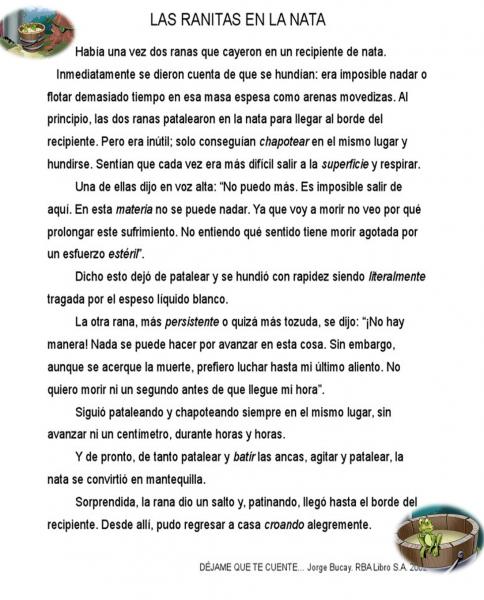 ¡MOMENTO DE LEER!Versión en línea En esta actividad, vamos a aprehender a comprender textos de manera inferencial o interpretativa, donde vamos identificar las principales ideas del texto y para eso lo haremos con estas actividades muy divertidas, donde pondrás en juego tu atención y comprensión lectora. Para empezar leeremos el texto "Las ranitas en la nata". por JENY PAULINA AGUIRRE GARCIA 1 LEE CON ATENCIÓN LAS RANITAS EN LA NATA En esta actividad, lee con mucha atención el texto "Las Ranitas en la Nata"; respetando los signos de puntuación, realiza la lectura de forma oral (voz alta) o mental como lo prefieras. 2 A LEER LAS RANITAS EN LA NATA 3 ¡MOMENTO DE LEER! 4 ¡OBSERVEMOS Y ESCUCHEMOS! Como ya leiste, ahora reforzaremos la lectura con este video. ¡Espero que te guste! 5 LAS RANITAS EN LA NATA 6 REFLEXIONO ¿Por qué crees que se salvó la ranita?¿Qué enseñanza de deja esta historia?