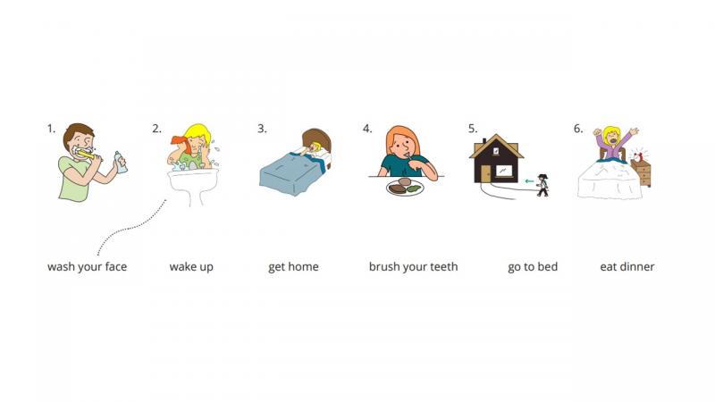 1.Brush your teeth 2.Wash your face 3.go to bed 4.eat dinner 5.get home 6.wake up