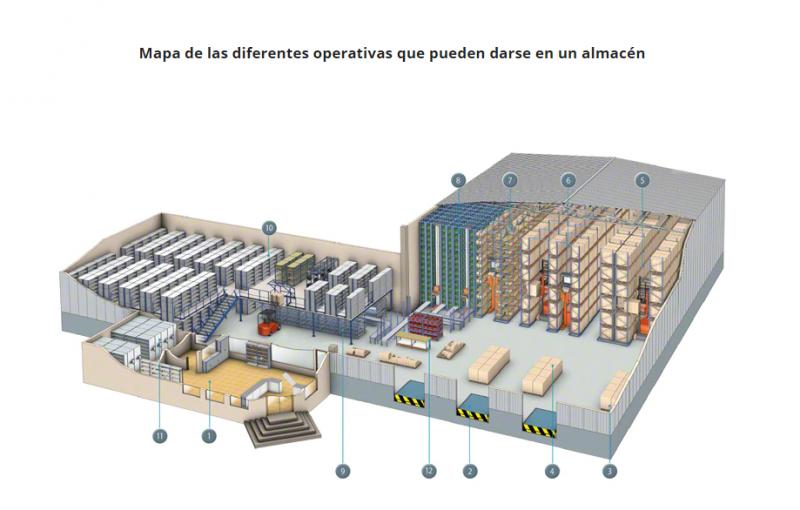 Áreas de un almacenVersión en línea Vamos a repasar las áreas de un almacén por Victor Díez 1 Edificio de oficinas y servicios 2 Muelles de carga y descarga. 3 Recepción y verificación. 4 Expediciones. 5 Almacén de alta rotación o producto voluminoso. 6 Picking de alta rotación sobre paletas.