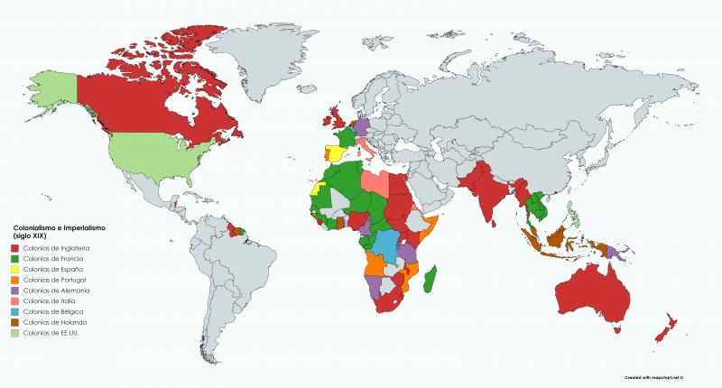 Colonialismo e ImperialismoVersión en línea En este mapa podrás encontrar los territorios colonizadas por los diferentes Países Centrales colonialistas. Hacé click en cada un de ellos e identifica cada uno de sus imperios y reconoce su extensión. por Lucía Losano 1 Hacé clik en España y reconocé todas sus colonias en AMARILLO 2 Hacé click en Italia y reconocé todas sus colonias en ROSA 3 Hacé click en Holanda y reconocé todas sus colonias en MARRÓN 4 Hacé click en Inglaterra y reconocé todas sus colonias en ROJO 5 Hacé click en Alemania y reconocé todas sus colonias en VIOLETA 6 Hacé click en Francia y reconocé todas sus colonias en VERDE OSCURO 7 Hacé click en Portugal y reconocé todas sus colonias en ANARANJADO 8 Hacé click en Bélgica y reconocé todas sus colonias en CELESTE 9 Hacé click en Estados Unidos y reconocé todas sus colonias en VERDE CLARO
