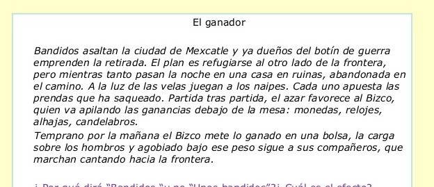 Evaluación Bimestral II Español 11°Versión en línea Evaluación Bimestral Once por Lida Marcela Barrera Chaparro 1 En el relato, las acciones se relacionan directamente con a la inconveniencia de los juegos de azar b el peligro de frecuentar casas en ruinas c la premeditación de un complot d el riesgo de habitar en Mexcatle 2 La actitud de los compañeros del “Bizco” se podría caracterizar como a involuntaria b cínica c ingenua d generosa 3 A partir de su estructura y contenido, el texto anterior se puede clasificar como a un microrrelato b una novela corta c un fragmento de cuento d un fragmento novelesco 4 En el primer párrafo, las comillas se emplean para a indicar un comentario hecho por uno de los personajes. b resaltar una expresión coloquial de uso frecuente. c señalar una frase célebre de un novelista actual. d destacar una particularidad de la expresión referida. 5 Del comentario anterior se infiere que “Ensayo sobre la ceguera” cuestiona a los métodos científicos empleados en el tratamiento de la ceguera b los riesgos que implica el defectuoso funcionamiento de los semáforos. c la falta de solidaridad humana, la insensibilidad y la degradación del mundo actual. d la deficiente atención hospitalaria ofrecida a los pacientes con ceguera blanca. 6 En el último párrafo se afirma: “José Saramago nos obliga a parar, cerrar los ojos y ver”. Con esto se quiere dar a entender que a solamente durante el sueño puede el ser humano ser libre y solidario. b la responsabilidad con los otros va más allá de la realidad que ven los ojos c las víctimas de la ceguera blanca solo pueden ver con los ojos cerrados. d el autor asume una actitud autoritaria con los lectores de su obra literaria 7 Por tratarse de una novela, “Ensayo sobre la ceguera” es una obra narrativa; en cambio, el comentario que se hace sobre ella es de tipo a argumentativo ya que es una reseña. b informativo ya que es una nota periodística. c descriptivo ya que es una anécdota literaria. d expositivo ya que es una nota enciclopédica.
