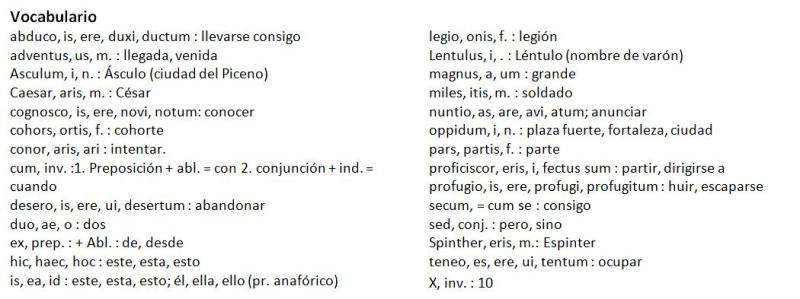 Latín Mc Graw-infinitivo 2Versión en línea Traduce este texto adaptado de César: Cum his duabus legionibus Asculum proficiscitur. Id oppidum Lentulus Spinther X cohortibus tenebat. Cum Caesaris adventus nuntiatur, profugit ex oppido. Cohortes secum abducere conatur, sed magna parte militum deseritur por Pepa Sanchis Llácer 1 Separa primero las oraciones: Cum his duabus legionibus Asculum proficiscitur. Id oppidum Lentulus Spinther X cohortibus tenebat. Cum Caesaris adventus nuntiatur, profugit ex oppido. Cohortes secum abducere conatur, sed magna parte militum deseritur Escoge una o varias respuestas a Cum his duabus legionibus Asculum proficiscitur. / Id oppidum Lentulus Spinther X cohortibus tenebat. / Cum Caesaris adventus nuntiatur, profugit ex oppido. / Cohortes secum abducere conatur, sed magna parte militum deseritur b Cum his duabus legionibus Asculum proficiscitur./ Id oppidum Lentulus Spinther X cohortibus tenebat. Cum Caesaris adventus nuntiatur, /profugit ex oppido. Cohortes secum abducere conatur, / sed magna parte militum deseritur c Cum his duabus legionibus Asculum proficiscitur./ Id oppidum Lentulus Spinther X cohortibus tenebat. / Cum Caesaris adventus nuntiatur, profugit ex oppido. / Cohortes secum abducere conatur, / sed magna parte militum deseritur 2 Traduce el verbo proficiscitur: Cum his duabus legionibus Asculum proficiscitur Escoge una o varias respuestas a se dirigía b es dirigido c se dirige/ se dirigió d ha sido dirigido 3 ¿Cómo se traduce el acusativo de dirección?: Cum his duabus legionibus Asculum proficiscitur a Ásculo b a Ásculo c en Ásculo d de Ásculo 4 Traduce el verbo: Id oppidum Lentulus Spinther X cohortibus tenebat. Escoge una o varias respuestas a ocupa b era ocupado c había ocupado d ocupaba 5 Agrupa las palabras: Id oppidum Lentulus Spinther X cohortibus tenebat. Escoge una o varias respuestas a Id oppidum (Lentulus Spinther) X cohortibus tenebat. b (Id oppidum) (Lentulus Spinther) X cohortibus tenebat. c (Id oppidum) (Lentulus Spinther) (X cohortibus) tenebat. d Id oppidum (Lentulus Spinther X) cohortibus tenebat. 6 Traduce el verbo "nuntiatur": Cum Caesaris adventus nuntiatur, profugit ex oppido Escoge una o varias respuestas a se anuncia/ se anunció b anuncia /anunció c era anunciado d había sido anunciado 7 Traduce "Profugit": Cum Caesaris adventus nuntiatur, profugit ex oppido Escoge una o varias respuestas a huirá b huyeron c huye / huyó d ha huido 8 Separa la subordinada de la principal: Cum Caesaris adventus nuntiatur, profugit ex oppido Escoge una o varias respuestas a Cum [Caesaris adventus nuntiatur, profugit] ex oppido b Cum Caesaris adventus [nuntiatur, profugit ex oppido] c [Cum Caesaris adventus nuntiatur], profugit ex oppido 9 Traduce el verbo "abducere": Cohortes secum abducere conatur, sed magna parte militum deseritur Escoge una o varias respuestas a se llevó consigo b llevarse consigo c se ha llevado consigo d se llevará consigo 10 Traduce el verbo "conatur": Cohortes secum abducere conatur, sed magna parte militum deseritur Escoge una o varias respuestas a intenta /intentó b es intentado / se intentó c ha sido intentado d fue intentado 11 Traduce el verbo "deseritur": Cohortes secum abducere conatur, sed magna parte militum deseritur a abandona / abandonó b Es abandonado / fue abandonado c Ha abandonado d Ha sido abandonado 12 Separa las dos proposiciones coordinadas: Cohortes secum abducere conatur, sed magna parte militum deseritur Escoge una o varias respuestas a Cohortes secum abducere conatur, / sed magna parte militum deseritur b Cohortes secum abducere / conatur, sed magna parte militum deseritur c Cohortes secum abducere conatur, sed magna parte/ militum deseritur 13 Agrupa palabras: Cohortes secum abducere conatur, sed magna parte militum deseritur Escoge una o varias respuestas a (Cohortes secum) abducere conatur, sed (magna parte) militum deseritur b Cohortes secum (abducere conatur), sed magna parte militum deseritur c Cohortes secum abducere conatur, sed (magna parte militum) deseritur d Cohortes secum abducere conatur, sed (magna parte) militum deseritur Explicación 1 Lo traduciremos en pasado por ser un presente histórico 2 El acusativo de dirección si n preposición se usa con los nombres de ciudad e indica el lugar adonde se va 6 Es también un presente histórico y lo traduciremos por pasado 10 También es un presente histórico 11 Es un presente histórico que se traduce como pasado