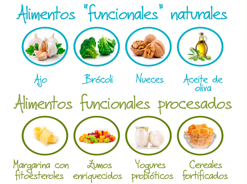 Un alimento funcional es aquel, que además de nutrir, produce algún efecto curativo deseable o importante sobre algún estado particular de salud, estos alimentos pueden ser naturales o procesados (p ej. el tomate y sus derivados). Los alimentos tradicionales son aquellos que aportan nutrientes básicos, pero no tienen o no se les ha comprobado algún tipo de actividad o propiedad sobre alguna condición particular de salud. Estos alimentos también pueden ser naturales o procesados (p ej. la panela). Un alimento saludable es aquel que se consigue con técnicas productivas limpias y a pesar de que no tiene una función específica para alguna condición especial de salud, sí aporta nutrientes importantes al organismo y su consumo continuado no es dañino. Los alimentos orgánicos son los que se cultivan o se producen utilizando insumos naturales y sin la aplicación de químicos de síntesis para su manejo, estos, además de ser alimentos saludables, también pueden ser funcionales. Los alimentos no orgánicos son aquellos en que el proceso de producción se soporta en la utilización de insumos químicos sintéticos que evitan el ataque de plagas o aumentan los índices de rendimiento. Muchos de estos químicos de síntesis pueden acumularse en los alimentos y generar problemas de salud para animales y personas al ser consumidos, algunos de estos alimentos pueden ser relativamente saludables y hasta funcionales. Si cualquiera de estos grupos de alimentos es sometido a alguna modificación genética, funcional o bioquímica de forma intencional para aumentar su resistencia a plagas, mejorar su eficiencia o aumentar el almacenamiento de alguna sustancia funcional, se denomina entonces alimento modificado.Un alimento funcional es aquel, que además de nutrir, produce algún efecto curativo deseable o importante sobre algún estado particular de salud, estos alimentos pueden ser naturales o procesados (p ej. el tomate y sus derivados). Los alimentos tradicionales son aquellos que aportan nutrientes básicos, pero no tienen o no se les ha comprobado algún tipo de actividad o propiedad sobre alguna condición particular de salud. Estos alimentos también pueden ser naturales o procesados (p ej. la panela). Un alimento saludable es aquel que se consigue con técnicas productivas limpias y a pesar de que no tiene una función específica para alguna condición especial de salud, sí aporta nutrientes importantes al organismo y su consumo continuado no es dañino. Los alimentos orgánicos son los que se cultivan o se producen utilizando insumos naturales y sin la aplicación de químicos de síntesis para su manejo, estos, además de ser alimentos saludables, también pueden ser funcionales. Los alimentos no orgánicos son aquellos en que el proceso de producción se soporta en la utilización de insumos químicos sintéticos que evitan el ataque de plagas o aumentan los índices de rendimiento. Muchos de estos químicos de síntesis pueden acumularse en los alimentos y generar problemas de salud para animales y personas al ser consumidos, algunos de estos alimentos pueden ser relativamente saludables y hasta funcionales. Si cualquiera de estos grupos de alimentos es sometido a alguna modificación genética, funcional o bioquímica de forma intencional para aumentar su resistencia a plagas, mejorar su eficiencia o aumentar el almacenamiento de alguna sustancia funcional, se denomina entonces alimento modificado.