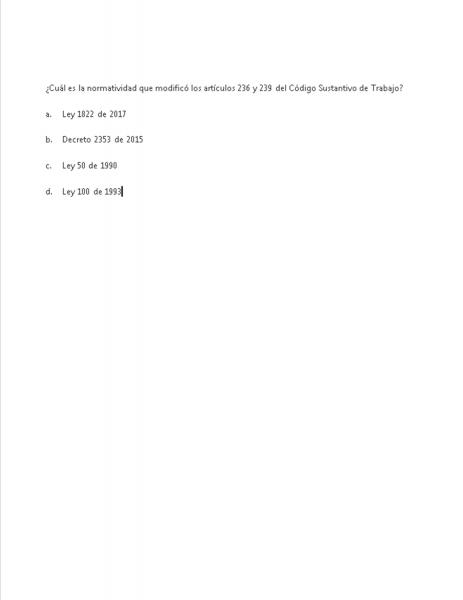 Licencia de maternidadVersión en línea Lee atentamente y responde por Yemag Morales 1 ¿Cuál es la normatividad que modificó los artículos 236 y 239 del Código Sustantivo de Trabajo? a Decreto 780 de 2016 b Decreto 2353 de 2015 c Ley 1822 de 2017 d Ley 100 de 1993 2 Toda trabajadora en estado de embarazo tiene derecho a una licencia de dieciocho (18) semanas en la época de parto, remunerada con el a primer salario recibido b promedio del salario c promedio devengado d último salario recibido 3 Determine en que artículo y normativa se establece el procedimiento para partos prematuros. a Art. 236 CST. b Art. 237 CST c Art. 34 Ley 50 de 1990 d Art. 1 Ley 1822 de 2017 4 El esposo o compañero permanente de la madre gestante tendrá derecho a ocho (8) días hábiles de licencia remunerada de paternidad, por los hijos nacidos del cónyuge o de la compañera. El único soporte válido para el otorgamiento de la licencia remunerada de paternidad es a Certificado de nacido vivo, que entregará a la EPS 20 días del nacimiento del menor. b Certificado de nacido vivo, que se entregará al empleador a los 30 días del nacimiento del menor. c Registro Civil de Nacimiento, que se entregará a la EPS a los 30 días del nacimiento del menor. d Registro Civil de Nacimiento, que se entregará al empleador a los 15 días hábiles del nacimiento del menor. 5 Si alguna trabajadora es despedida por motivo de embarazo o lactancia sin la autorización previa del Ministerio de Trabajo que avale una justa causa, tendrá derecho al pago adicional de una indemnización igual a a sesenta (60) días hábiles de trabajo, más indemnizaciones, sin prestaciones de ley, conforme a la relación laboral vigente. b treinta (30) días de trabajo, más indemnizaciones, y prestaciones de ley, conforme a la relación laboral vigente. c Dos meses de salario, más indemnizaciones y prestaciones de ley, conforme a la relación laboral vigente. d sesenta (60) días calendario de trabajo, sin indemnizaciones, y con prestaciones de ley, conforme a la relación laboral vigente.