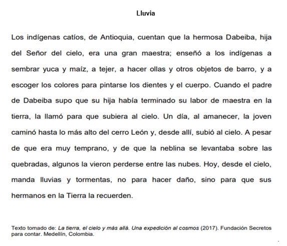 Prueba de comprensión lectora Versión en línea Después de leer el texto responda las siguientes preguntas: por doris yotagri 1 Según el texto, Dabeiba enseñó a los catíos a a perderse entre las nubes b cocinar con yuca y maíz c Fabricar ollas de barro d Crear lluvias y tormentas 2 luego de subir al cerro León, Dabeiba a Se perdió entre las nubes y subío al cielo b Se hizo maestra de los indígenas catíos c Enseño a sus hermanos a sembrar y a tejer d Pintó de colores sus dientes y su cuerpo 3 En el texto, la expresión " no para hacer daño" se refiere a: a Los castigos que recibía el pueblo catío. b La fuerza destructora de las tormentas. c La maldad de Dabeiba y de su padre. d Las fuertes corrientes que las quebradas. 4 Del texto anterior se puede concluir que Dabeiba a Era la hija favorita del Señor del cielo b Enseño a sus hermanos secretos prohibidos c Nunca regresó junto a sus hermanos catíos d Se transformó en agua de lluvia de tormentas. 5 Del regreso de Dabeiba al cielo por orden de su padre, se puede decir que: a Su padre estaba decepcionado por su labor. b Sus hermanos eran desagradecidos con ella. c Sus labores debían continuar en pueblo. d Su pueblo ya no la necesitaba para sobrevivir.