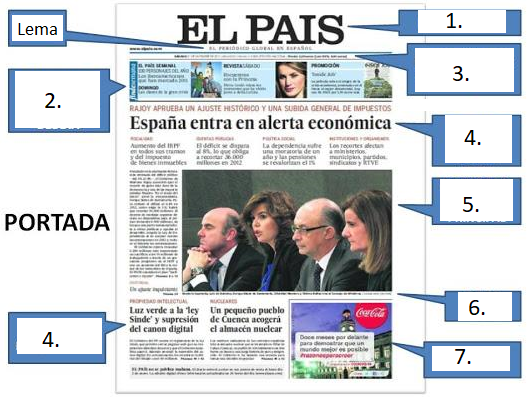 Portada o primera planaVersión en línea Ubica los nombres de las partes del periódico donde corresponde por DIANA RIOS 1 La cabecera del periódico 2 Sumario de noticias destacadas del día. 3 Datos técnicos. 4 Los titulares o noticia del día 5 Fotografías 6 Noticias del día 7 Cabeza o pie de foto 8 Orejilla o publicidad.