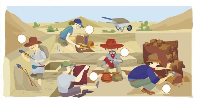 ¿Qué hacen los arqueólogos?Versión en línea Lee con atención los incisos y colócalos en el lugar de la imagen al que corresponden. por María Hernández 1 a) Los pueblos de la zona eran agricultores, según las SEMILLAS encontradas. 2 b) Desconocían el trabajo con los metales, pues sus HERRAMIENTAS eran de PIEDRA. 3 c) Los restos de PRENDAS DE VESTIR indican que contaban con telares manuales. 4 d) Las viviendas estaban hechas de BARRO COCIDO, por lo que conocían la alfarería. 5 e) Los diseños de VASIJAS son similares a otros de la zona, seguramente comerciaban con otros pueblos. 6 PLUS) Es la herramienta que utilizan los arqueólogos para cargar la tierra sobrante de los lugares donde excavan.