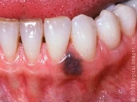 Patología BucalVersión en línea Preguntas sobre las patologías más frecuentes en la cavidad oral por Eduardo Julio Chauca Edwards 1 El significado de la palabra "leucoplasia" es: a Mancha blanca b Lesión redondeada c Placa blanca d Placa elevada 2 Qué lesión nos muestra la imagen a Mácula b Pápula c Vesícula d Verruga plana 3 La característica principal de la Candidiasis seudomembranosa es: a Placa blanca sangrante b Placa blanca no desprendible c Placa blanca desprendible d Placa blanca rugosa 4 El mucocele es: a Lesión localizada en la submucosa b Lesión en piel, elevada de contenido sólido c Lesión elevada líquida producto del virus del Herpes d Lesión producida por obstrucción de una glándula salival menor 5 La Estomatitis Herpética Primaria es producida por: a Virus del Herpes Simple b Virus del Herpes Zoster c Virus de la Hepatitis B d Virus del Papiloma Humano 6 Las petequias se producen por: a Infección viral b Hemorragia capilar c Acumulación de saliva d Reacción alérgica 7 Entendemos "lesión tumoral" como: a Aumento de volumen sin ningún otro significado b Cáncer benigno c Cáncer maligno d Toda lesión con superficie elevada 8 Las piezas dentales que mayormente se encuentran afectadas por pólipos pulpares son: a Incisivos b Caninos c Premolares d Molares 9 La caries del cemento se presenta generalmente en: a jóvenes b mujeres c mayores de 50 años d menores de 50 años 10 La pulpitis reversible se caracteriza por: a Dolor localizado y agudo al estímulo b Dolor no localizado y crónico al estímulo c Dolor localizado y agudo espontáneo d Dolor localizado y crónico al estímulo