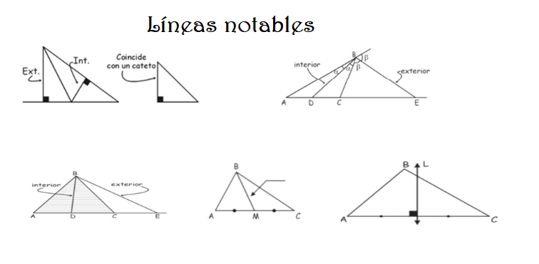 Líneas notablesVersión en línea Señala las líneas notables en los triángulos. por Victor Manuel Carranza Panta 1 Altura 2 Mediatriz 3 Mediana 4 Ceviana Interior 5 Ceviana Exterior 6 Bisectriz Interior 7 Bisectriz Exterior