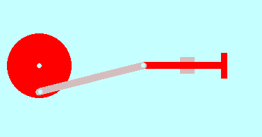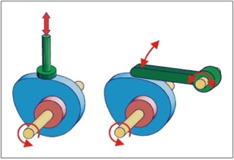 Permite obtener un movimiento giratorio continuo a partir de uno oscilante, o también, obtener un movimiento oscilante a partir de uno giratorio continuo. Se puede encontrar en las máquinas de coser (para obtener el movimiento giratorio necesario en la máquina a partir del oscilante del pie), en los limpiaparabrisas de los automóviles. Tomado de http://concurso.cnice.mec.es/cnice2006/material107/mecanismos/mec_excent-biela-palanca.htm