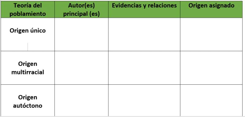 Teorías poblamiento de AmericaVersión en línea Hola estimado(a) de Historia de México. En este material podrás poner a prueba tu conocimientos respecto a las teorías científicas del poblamiento de América. Recuerda colocar cada elemento en la celda correspondiente. Mucho ánimo y éxito por javier perez lopez 1 Paul Rivet 2 Florentino Ameghino 3 Alex Hrdlicka 4 Origen asiático-mongoloide 5 Semejanzas antroposomáticas 6 4 raíces u origenes 7 Argumentos 4 origenes 8 El origen en américa del Sur 9 error en la prueba de carbono 14