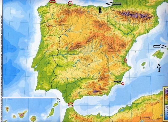 Relieve EspañaVersión en línea Relieve que hay que estudiarse para el examen de geografía de la clase de 3ºA de ESO del Instituto IES Floridablanca por Alberto Medina Vaquero 1 Submeseta Norte 2 Submeseta Sur 3 Sistema Central 4 Montes de Toledo 5 Montes de León 6 Cordillera Cantábrica (Picos de Europa) 7 Sistema Ibérico 8 Sierra Morena 9 Montes Vascos 10 Pirineos (Aneto) 11 Cordilleras Costero-Catalanas 12 Cordilleras Béticas (C. Subbética, C. Penibética Sierranevada, Mulhacén) 13 Depresión del Ebro 14 Depresión del Guadalquivir 15 Ibiza 16 Formentera 17 Mallorca / Sierra de Tramuntana 18 Menorca 19 Cabrera 20 La Palma 21 La Gomera 22 El hierro 23 Tenerife (Teide) 24 Gran Canaria 25 Lanzarote 26 Fuerteventura 27 Mar Cantábrico / Golfo de Vizcaya 28 Océano Atlántico 29 Mar Mediterráneo 30 Ría de Bilbao 31 Rías Gallegas 32 Golfo de Cádiz 33 Golfo de Almería / Cabo de Gata 34 Golfo de Mazarrón 35 Golfo de Alicante 36 Golfo de Valencia 37 Golfo de Roses 38 Golfo de León 39 Cabo de Matxitxako 40 Cabo de Peñas 41 Punta de Estaca de Bares / Cabo ortegal 42 Cabo de Finisterre 43 Cabo de San Vicente 44 Punta de Tarifa / Estrecho de Gibraltar 45 Cabo de Palos 46 Cabo de Nao 47 Cabo de Creus 48 Mar Menor 49 La Albufera