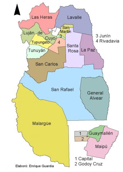 OTM DEPARTAMENTOS Versión en línea Actividad interactiva sobre los departamentos de la provincia de Mendoza. por Emi G. 1 Su economia se sustenta en el turismo y es considerada la segunda ciudad mas grande de Mendoza 2 Limita con Junín, cuenta con alrededor de 30.000 personas 3 Subdividido en 12 distritos, uno de ellos es Lulunta 4 La principal actividad economica es el cultivo e industrialización de la vid 5 Importante por su producción de vino, se divide en 15 distritos, uno de ellos es Cacheuta 6 se caracteriza por la extraordinaria cantidad de espectaculares e impresionantes paisajes, en él se encuentra el centro de sky ´´Las Leñas´´ 7 Se caracteriza por el cultivo de Manzana y viñas. Se encuentra al sur de la ciudad 8 Su superficie pertenece al bioma Chaqueño, su economia se sustenta de la agricultura y ganadería. Limita al norte de San Martín y La Valle 9 Las precipitaciones son escasas, y sus temperaturas muy extremas. Es conocido como el desierto mendocino 10 Departamento cercano al Aeropuerto, está onformado por 15 distritos, entre ellos El Challao. Forma parte del gran Mendoza. 11 En cuanto a sus industrias se destacan la vitivinicultura y la olivicultura. Además, tiene el 90% de su territorio cultivado. Limita con Maipú 12 Sitio estratégico del MERCOSUR. Departamento menos poblado de Mendoza. Principal entrada de la provincia de Mendoza por el arco de desaguadero 13 Se ubica en la región central de la provincia. Es el más poblado de la misma. Su extensión es de 164 km^2. Está subdividido en 21 distritos. 14 Forma parte del gran Mendoza. Es el segundo departamento mas pequeño de la provincia en cuanto a superficie. Es la tercera ciudad más poblada de Mendoza. Gran cantidad de edificios y espacios verdes. 15 Departamento más antiguo de la provincia. Ha experimentado un gran crecimiento turístico debido a la Laguna del Diamante. Limita con San Rafael. Se destaca la actividad agroindustrial. 16 Una de las ciudades mas importantes de todo Mendoza. Se encuentra situada en el centronorte de la provincia, en el importante corredor carretero y ferroviario que une a Buenos Aires con la ciudad de Mendoza. 17 Es la ciudad cabecera del departamento homónimo. En los ultimos años ha desarrollado con éxito la ganadería. Anualmente celebra la fiesta de la ganadería de las zonas áridas 18 Una de las principales ciudades del país. Principal polo industrial. Ciudad de la región de Cuyo.