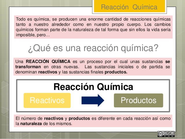 Reacciones químicasVersión en línea Introducciones a Reacciones Quimicas por Roxana fernandez 1 ¿Qué son las Reacciones Químicas? 2 Cambios Físicos y Químicos 3 Cambios Físicos y Químicos 4 ¿Cómo me doy cuenta de una reacción química? ¿CÓMO ME DOY CUENTA SI HA OCURRIDO UNA REACCION QUÍMICA?Tenemos que observar ciertos INDICADORES:Se produce una efervescencia (producción de gases)Se libera o absorbe energía Cambio de colorAparece un precipitado o sustancia insoluble 5 Indicadores de Reacción 6 Reacciones Químicas 7 ¿Cómo ocurre una Reacción Química? 8 Ecuaciones Químicas 9 Ley de Conservación de la Masa 10 Reacciones Químicas Cotidianas Cada día, a nuestro alrededor y en nosotros mismos, ocurren reacciones químicas. ¿Reconoces alguna?