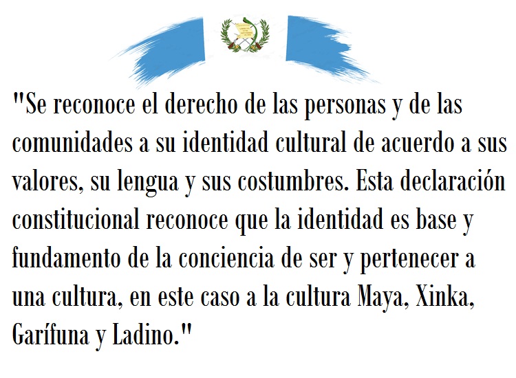 La Constitución Política de la República de Guatemala aborda especialmente en sus artículos 58, 66 y 76 el tema de la EBI, los derechos de las personas y de las comunidades a su identidad cultural de acuerdo a sus valores y la protección de los diferentes grupos étnicos del país.