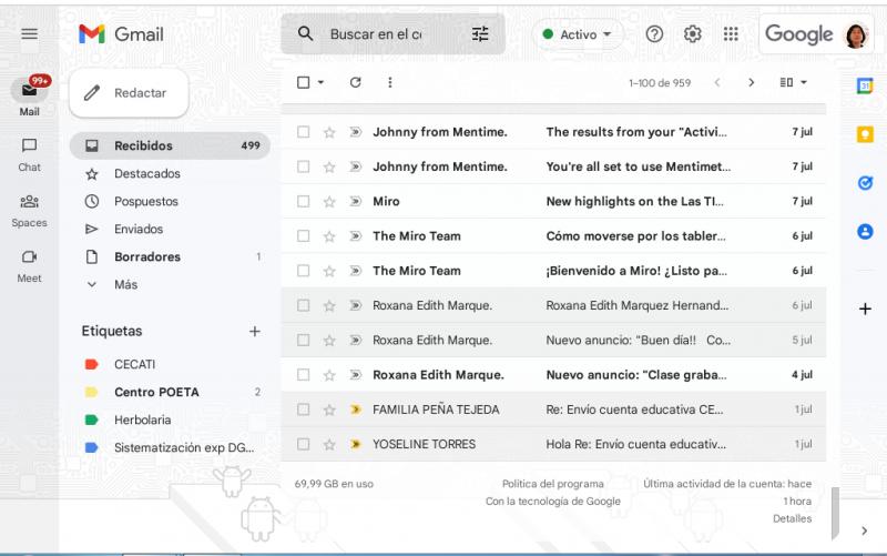 Interfaz GmailVersión en línea Realiza el ejercicio las veces que requieras para identificar cada uno de los elementos de la interfaz. por Maribel González 1 Menú principal 2 Página principal de Gmail 3 Caja de búsqueda 4 Configuración 5 Menú de Aplicaciones de Google 6 Cuenta/Cerrar sesión 7 Redactar correo 8 Lista de etiquetas 9 Meet 10 Chat 11 Seleccionar. 12 Actualizar 13 Más 14 Contador de correos/páginas 15 Pestañas/Categorías 16 Bandeja de entrada 17 Porcentaje de uso/Detalles 18 Panel lateral