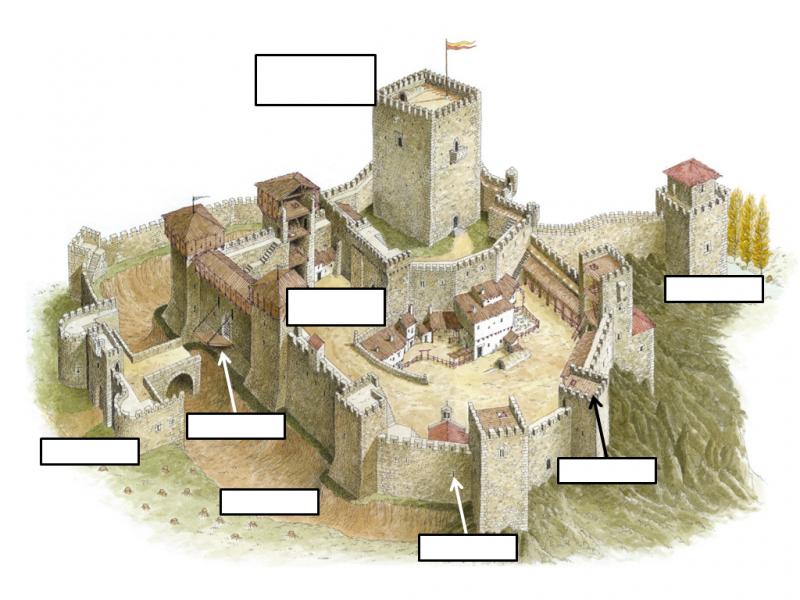 El Castillo FeudalVersión en línea Identifica las principales secciones de un típico castillo feudal. por COORDINADORES SEP 1 Torre del Homenaje 2 Puente Levadizo 3 Barbacana con dos torres 4 Foso 5 Patio de Armas 6 Almenas 7 Torre Albarrana 8 Coracha