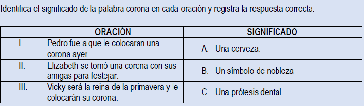 SIGNIFICADO DE LAS PALABRASVersión en línea Elige la respuesta correcta para cada pregunta. por LOU-VAN KAOMI ESTRADA PÉREZ 1 1. El conjunto de elementos lingüísticos que incluyen, preceden o siguen a una palabra u oración y que pueden determinar su significado o su correcta interpretación, es el: a TEXTO b SINTAXIS c CONTEXTO d GRAMÁTICA 2 2. Identifica el significado de la palabra corona en cada oración y registra la respuesta correcta. a a. IA, IIB, IIIC b b. IC, IIB, IIIA c c. IC, IIA, IIIB d d. IB, IIC, IIIA 3 3. De la oración “Había mucha cola en el cajero automático”, la palabra “cola”, significa: a a. Parte del cuerpo b b. Fila, conjunto de personas de manera ordenadas. c c. Pegamento. 4 4. En la oración “el detenido cantó”, el verbo cantó quiere decir: a a. Dijo todo lo sucedido. b b. Producir sonidos armoniosos con la voz. c c. Interpretar 5 5. En la oración “Préstame ese banco, pues ya estoy muy cansada”, la palabra “banco” significa: a a. Empresa comercial que realiza operaciones financieras con el dinero de accionistas y clientes b b. Asiento con respaldo o sin él. c c. Edificio, local u oficina en que una institución bancaria atiende al público.