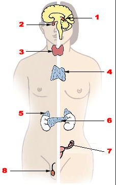 De entre las hormonas que segrega el páncreas se encuentran: Insulina, disminuye la concentración de glucosa, aminoácidos y ácidos grasos y fomenta su metabolismo por las células tisulares (de los tejidos). Somatostatina, su papel primario es el de regular las demás células endocrinas del páncreas. El timo es una glándula situada en el mediastino, justo detrás del esternón. Está considerado primariamente como un órgano linfático aunque se ha aislado la hormona timosina que estimula el desarrollo de células T (coordinan la respuesta inmune celular).