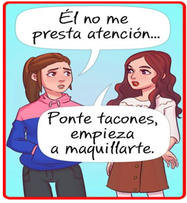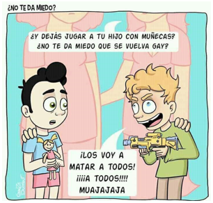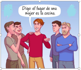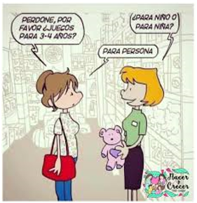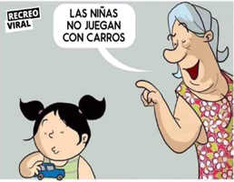 Prueba diagnóstica de GéneroVersión en línea Se presentan una imágenes con situaciones sobre roles de género y tú las interpretas y seleccionas las respuestas que le dan validez al mensaje de la imagen por Silvia Elizabeth Bermudez Ramos 1 La expresión que está escrita es: a Verdadero b Falso 2 La señora tiene razón al decirle a la niña que las niñas no juegan con carros a Verdadero b Falso 3 Si piensas en el futuro de ambos niños. A cuál de ellos crees que le tendrías miedo? a Al niño de la muñeca b Al niño del arma 4 Por qué crees que al hombre le hacen unas preguntas distintas a las que le hacen a la mujer? Escoge una o varias respuestas a Porque al hombre lo ven como un profesional y a la mujer no. b Porque a la mujer le piensan regalar ropa nueva c Porque realmente ella es más bonita que él y llama más la atención d Porque en la mujer solo se fijan lo externo y en el hombre su capacidad 5 ¿Crees que ellos también pueden estar en la cocina cocinando, lavando trastes? a No pueden b Sí pueden 6 ¿Qué crees que se interpreta de esta imagen? a Que la vendedora le ofrece juego para niño y para niña b Que la mamá busca juguete para niña o para niño c Que la mamá no piensa en juguetes para niña o para niño sino que piensa talvez en la diversión de su hijo/a d La vendedora quiere que compre el oso 7 Crees que el consejo de la amiga para llamar la atención del chico le da valor a la mujer? a Si, porque se va a ver más bonita b Sí, porque va a insistir c No, porque el maquillaje no le va a hacer más valiosa (inteligente, buena conversadora) d No, porque los tacones talvez no le gusten Explicación 1 Las niñas y los niños les gusta un juguete porque se divierten con él. 2 Las niñas y los niños les gusta un juguete porque se divierten con él. 3 La gente ve con malos ojos a niños jugando con juguetes de niñas 4 Un hombre no es superior a una mujer 5 Hay actividades que las pueden hacer tanto hombre como mujeres 7 ¿En qué radica el valor de una mujer?