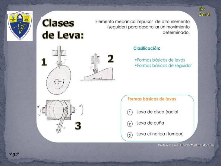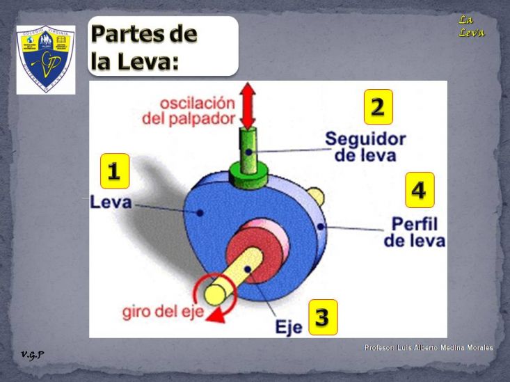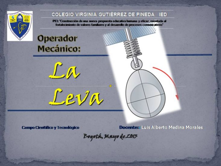 La LevaVersión en línea Operador mecánico: La leva por elprofe luis1 1 Bienvenida COLEGIO VIRGINIA GUTIÉRREZ DE PINEDA IEDBIENVENIDOS AESTA EXPOSICIÓNLuis Alberto Medina 2 Portada 3 Partes de la Leva 4 VIDEO de Movimiento de Leva 5 Clases de Leva 6 Gracias
