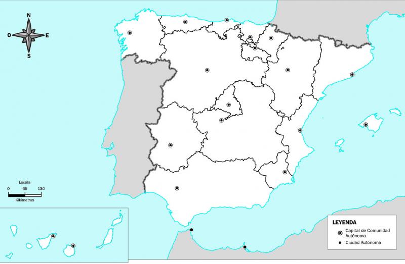 Comunidad autónoma y capitalVersión en línea Mapa sobre las diferentes comunidades autónomas de España y sus capitales por Sonia Ibáñez Nadal 1 Galicia 2 Santiago de Compostela 3 Oviedo 4 Asturias 5 Aragón 6 Zaragoza 7 Cantabria 8 Santander 9 País Vasco 10 Vitoria-Gasteiz 11 Navarra 12 Pamplona 13 Logroño 14 La Rioja 15 Castilla Y León 16 Valladolid 17 Madrid 18 Cataluña 19 Barcelona 20 Comunidad Valenciana 21 Valencia 22 Castilla la Mancha 23 Toledo 24 Murcia 25 Islas Canarias 26 Santa Cruz de Tenerife 27 Las Palmas de Gran Canaria 28 Andalucía 29 Sevilla 30 Ceuta 31 Melilla 32 Extremadura 33 Mérida 34 Islas Baleares 35 Palma de Mallorca