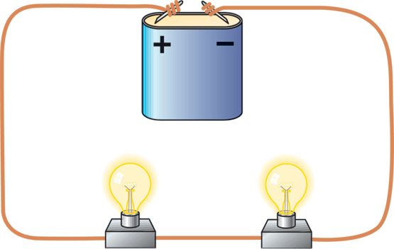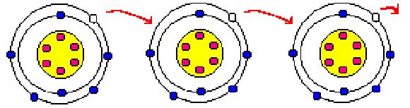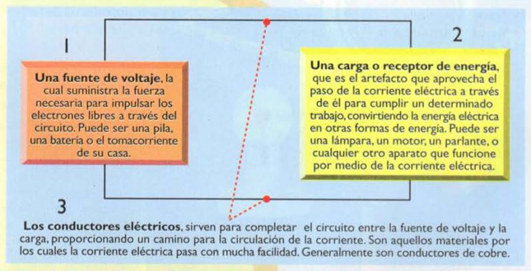 Antes de explicar más a detalle los elementos necesarios en un circuito, hay que explicar de qué se trata la existencia de electrones. Pues para esto, considérese ver el material conductor de cobre con un microscopio e imagine que es posible ver los átomos los cuales conforman el material de cobre. Ahora bien, el principio de la electricidad consiste en la circulación o movimiento de electrones a lo largo del conductor, por lo tanto, cuando encendemos la televisión, lo que hace que esta encienda es el movimiento continuo de electrones desde el tomacorriente hasta el televisor mismo. cabe aclarar que los electrones vienen dados por los átomos del alambre de cobre conductor. Entonces, hay que buscar una manera de mover los electrones para que estos se muevan hacia el televisor y así éste pueda llegar a encender. Por obvias razones, en primera instancia hay que quitar un electrón de un átomo para que el mismo pueda adherirse a otro que le siga así sucesivamente pasa con todos los infinitos átomos que contiene el alambre de cobre. (Véase la figura).