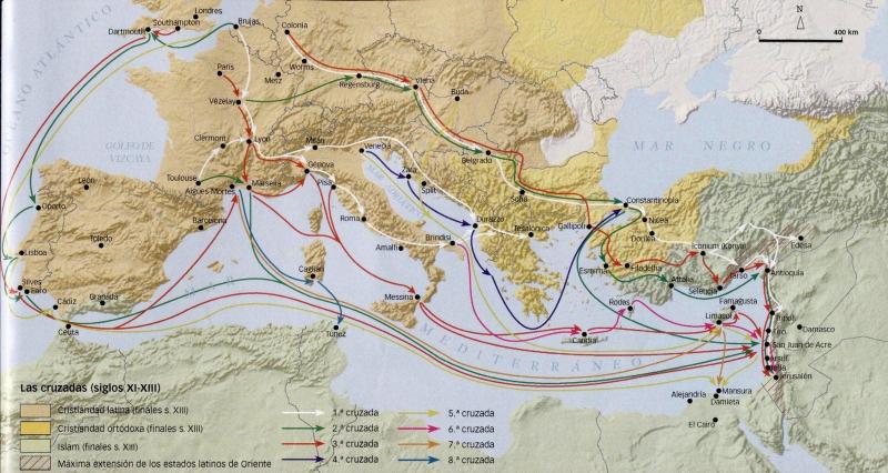 Edad MediaVersión en línea Las Cruzadas (siglos XI - XIII) por JUAN CARLOS ARÉVALO T. 1 Desde fines del siglo XI hasta mediados del XIII se desataron terribles: a guerras entre los cristianos europeos y los musulmanes. b guerras entre los Alemanes y los Judíos. c guerras entre los amigos cristianos vs los musulmanes. 2 Qué ponía en peligro la hegemonía católica en Europa, ya que estaban a punto de tomar Bizancio. a el avance de los turcos musulmanes. b el avance de los judíos c el avance de los Romanos. 3 Por qué Urbano II, en 1095, llamó a la primera cruzada. a Frente a la amenaza de los turcos musulmanes, el emperador bizantino pidió ayuda al papa y a la unidad cristiana. b El emperador bizantino invito al papa y a la comunidad cristiana. c El emperador bizantino pidió armas. 4 Qué se pensaba con las guerras Santas: a retomar los lugares sagrados y quitarles el control de las rutas comerciales. b retomar los negocios. c quitarles el control de las Iglesias. 5 ¿Cuántas Cruzadas hubo ? a Fueron ocho b Fueron 28 c Fueron 2 6 ¿Qué se proponían los cristianos europeos con estas guerras? a retomar los lugares sagrados y quitarles el control de las rutas comerciales. b Medios: Servicios de difusión de información c Difusión de la cultura clásica 7 Consecuencias de las Cruzadas Escoge una o varias respuestas a Se unificó Europa bajo una sola fe e identidad religiosa. Se afianzó la autoridad papal. b Se desarrollaron las industrias vinculadas a la guerra (armas y textiles). c Se intensificó el comercio entre Oriente y Europa. d El sistema feudal comenzó a resquebrajarse, ya que muchos nobles murieron en las batallas o se quedaron en Tierra Santa. 8 Cuál fue el efecto más importante fue que los cruzados llevaron a Europa. a La rica cultura y tecnología árabes. b Las mujeres. c Esclavos musulmanes. 9 Entre las innovaciones más interesantes de la Edad Media. a El uso del arado con ruedas y vertedera, el uso de animales para tirar del arado, el uso del molino de viento o de agua para moler más fácilmente el grano y, sobre todo, el sistema de rotación trienal de los campos. b guerras entre los cristianos europeos y los musulmanes. c Las rutas comerciales 10 ¿Quiénes se enfrentaron en las guerras de las Cruzadas? a Los cristianos europeos y los musulmanes b El emperador bizantino contra los cristianos. 11 En qué año se tomaron Anatolia los turcos musulmanes a 1071 b 2000 c 1001 Explicación 1 Desde fines del siglo XI hasta mediados del XIII se desataron terribles guerras entre los cristianos europeos y los musulmanes. 2 El conflicto tuvo varias causas; por un lado, el avance de los turcos musulmanes en la zona de Anatolia ponía en peligro la hegemonía católica en Europa, ya que estaban a punto de tomar Bizancio. 3 El emperador bizantino pidió ayuda al papa y a la unidad cristiana. Así fue como Urbano II, en 1095, llamó a la primera cruzada. 4 Con estas guerras se pensaba retomar los lugares sagrados que en ese momento los musulmanes controlaban en en los actuales territorios de Israel y Palestina. 5 Con estas motivaciones, los europeos se lanzaron a la guerra; en total, fueron ocho cruzadas. 6 Con estas guerras se pensaba retomar los lugares sagrados que en ese momento los musulmanes controlaban en en los actuales territorios de Israel y Palestina, pero también quitarles el control de las rutas comerciales más importantes. 7 Los efectos de estos casi doscientos años de guerra, en los que los dos bandos tuvieron derrotas y victorias. 8 Sin embargo, el efecto más importante fue que los cruzados llevaron a Europa la rica cultura y tecnología árabes, con la que el Viejo Continente se enriqueció profundamente y con la que la sociedad medieval comenzó un proceso de cambio. 9 Entre las innovaciones más interesantes de aquellos años están el uso del arado con ruedas y vertedera, el uso de animales para tirar del arado, el uso del molino de viento o de agua para moler más fácilmente el grano y, sobre todo, el sistema de rotación trienal de los campos. 10 Desde fines del siglo XI hasta mediados del XIII se desataron terribles guerras entre los cristianos europeos y los musulmanes