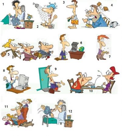 RutinaVersión en línea Ejercicio de relacionar acciones con viñetas, diseñado como repaso para estudiantes de español A2. por Pablo Torrado 1 Me levanto :( (es lo que menos me gusta del día) 2 ¡Vuelvo a casa! ¡Por fin! 3 Veo una película con mi familia 4 Me visto 5 Termino de trabajar :D 6 Ceno con mi esposa :) 7 Me acuesto, ¡es la hora! 8 Desayuno unas tostadas y café 9 Me ducho (y canto un poco) 10 Empiezo a trabajar, tengo mucho que hacer 11 Voy al trabajo, un poco tarde 12 Como... la comida en mi trabajo no es la mejor...