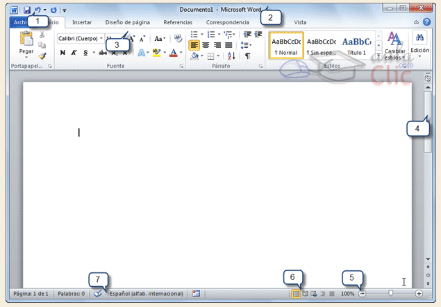 entorno de wordVersión en línea En esta actividad reforzaras las partes que componen el entorno de Word 2010 por luz Anda 1 barra de titulo 2 barra de acceso rapido 3 cinta de opciones organizada en pestañas 4 barra de desplazamiento 5 zoom 6 vista de documento 7 barra de estado