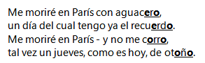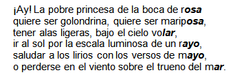 LA RIMA ASONANTE Y CONSONANTEVersión en línea Evaluación de los aprendizajes adquiridos en el área de lengua y literatura durante la semana de estudios(14 al 18 de Junio). por William Murillo 1 ¿Qué son las rimas? Selecciona una o varias respuestas a Son frases de una carta. b Es la coincidencia de sonidos en las palabras finales de cada verso. c Es una escritura en la que se repiten las palabras. 2 ¿Cuáles son las dos clases de rima hemos estudiado? Selecciona una o varias respuestas a Asonante. b Condicionantes. c Asociadas. d Consonante. 3 ¿Qué es la rima consonante? Selecciona una o varias respuestas a Es aquella rima en la que solo coinciden las vocales al final del verso. b Es aquella rima en la que todas las letras finales de las palabras al final de los versos coinciden, vocales y consonantes. c Asociadas. d Consonante. 4 ¿Qué es la rima asonante? Selecciona una o varias respuestas a Es aquella rima en la que solo coinciden las vocales al final del verso. b Es aquella rima en la que todas las letras finales de las palabras al final de los versos coinciden, vocales y consonantes. c Asociadas. d Consonante. 5 Seleccioné las palabras que podemos utilizar para formar una rima consonante. Selecciona una o varias respuestas a Cantando b Pelota c Andando d Melón 6 En el siguiente ejercicio indique la rima es consonante. Selecciona una o varias respuestas a Abro, plancho, ajo, rato. b Comando, andando, blando, sumando. c Andando d Melón 7 Seleccioné las palabras que podemos utilizar para formar una rima asonante. Selecciona una o varias respuestas a Vana b Flor c Humana d Canción 8 En el siguiente ejercicio indique si la rima es asonante. Selecciona una o varias respuestas a Aguacero, recuerdo, tiesta, tierra b Blando, sumando, comando, andando. c Humana d Canción 9 Lea detenidamente y seleccione cuál de las siguientes rimas es Asonante Selecciona una o varias respuestas a Rima en versos de Rubén Darío b Rima en versos de César Vallejo c Humana d Canción 10 Lea detenidamente y seleccione cuál de las siguientes rimas es Consonante Selecciona una o varias respuestas a Rima en versos de Rubén Darío b Rima en versos de César Vallejo c Humana d Canción Explicación 1 Semejanza o igualdad de sonidos entre dos o más palabras a partir de la última sílaba acentuada; en especial, aquella que se produce entre las palabras finales de los versos de un poema. 2 La rima es el conjunto de los sonidos consonantes y asonantes empleado en una composición lírica o por un autor en toda su obra. 3 Se conoce como rima consonante o rima perfecta a un tipo de repetición poética que se da al coincidir sonoramente todos los fonemas que siguen a la sílaba tónica de la última palabra del verso. Es decir, cuando coinciden las últimas sílabas de un verso con uno posterior. 4 En la rima asonante se repiten las vocales de las palabras específicamente a partir de la última vocal tónica del verso, las consonantes pueden variar. 5 La rima consonante se produce cuando los fonemas de sus últimas letras coinciden a partir de la vocal acentuada. 6 La rima consonante se produce cuando los fonemas de sus últimas letras coinciden a partir de la vocal acentuada. 7 La rima consonante se produce cuando los fonemas de sus últimas letras coinciden a partir de la vocal acentuada. 8 La rima consonante se produce cuando los fonemas de sus últimas letras coinciden a partir de la vocal acentuada. 9 La rima consonante se produce cuando los fonemas de sus últimas letras coinciden a partir de la vocal acentuada. 10 La rima consonante se produce cuando los fonemas de sus últimas letras coinciden a partir de la vocal acentuada.
