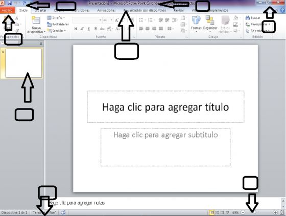 Interfaz PowerPoint.Versión en línea Identificar las partes dela interfaz de PowerPoint 2010 por Karla Yoshimi Duarte Roman 1 Menú Archivo 2 Barra de herramientas de acceso rapido 3 Pestañas de opciones 4 Botones de acción 5 Diapositivas en miniatura 6 Barra de estado 7 Zoom